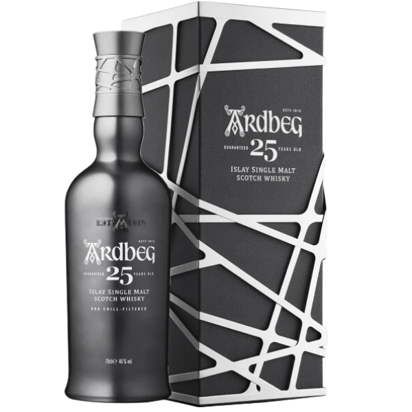 Der Ardbeg 25 Jahre Islay Single Malt Whisky aus Schottland wurde mit viel Liebe zum Detail hergestellt und ehrt die rund zwei Jahrhunderte währende Erfolgsgeschichte der Marke. Fans von Islay Malt sollten sich diesen Scotch auf keinen Fall entgehen lassen. Obwohl das Sortiment inzwischen eine Reihe an NSA Whiskys ohne Age Statement umfasst, hat man sich in diesem Fall für eine Altersangabe entschieden. Der hochwertige Ardbeg 25 Jahre Islay Single Malt Whisky reifte mehr als zwei Jahrzehnte lang in amerikanischen Bourbonfässern. Soll es Single Malt voller Selbstbewusstsein und Aussagekraft sein, ist dieser schottische Whisky genau das Richtige.
