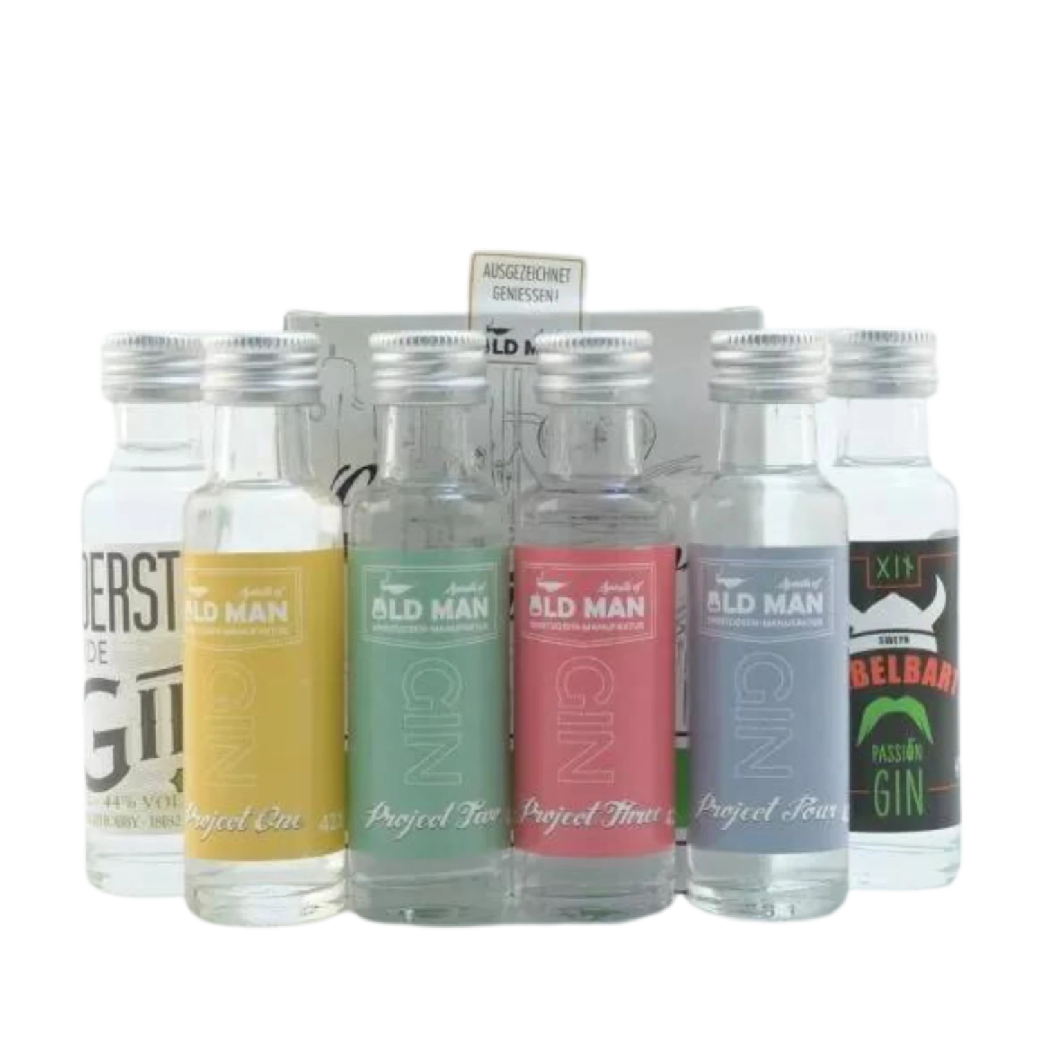 Das praktische Gin Tastingbox by Spirits of Old Man Set umfasst sechs Miniaturen mit jeweils 0,02 l Inhalt. In diesen Mini-Flaschen ruhen hochwertige Sorten an German Gin, die man am besten in die Kategorie Dry Gin und Western Dry Gin einstuft. Erste Rubrik verschreibt sich dem klassischen, feinwürzigen Genuss mit trockenen Wacholdernoten. Dahingegen steht die zweite Rubrik für moderne Experimente mit einem Botanical-lastigen Profil. Die Gin Tastingbox by Spirits of Old Man mit 6 Fläschchen berücksichtigt die eigenen Produkte von Spirit of Oldman, die bei einer Gin-Verkostung für spannende Abwechslung sorgen.