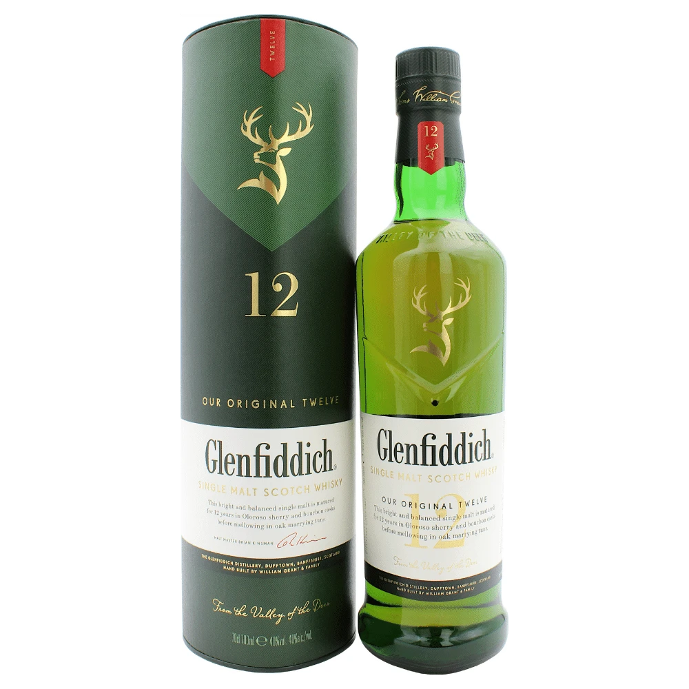 Da der Glenfiddich 12 Jahre mehr als zehn Jahre reifen darf, ist er weniger stark als manch anderer schottischer Whisky. Er hat einen verhaltenen Alkoholgehalt von 40 % vol. und eignet sich besonders gut für all jene, welche sich zum ersten Mal an schottischen Whisky heranwagen. Der Glenfiddich 12 Jahre wurde zwar unter Zusatz von Farbstoffen hergestellt, doch sein einzigartiger Farbton ist dies wert. Dadurch, dass er kalt gefiltert wurde, ist er weder in Aroma noch in Geschmack aufdringlich oder zu würzig. Man sollte ihn unverdünnt genießen, vielleicht mit ein paar Eiswürfeln verfeinert.