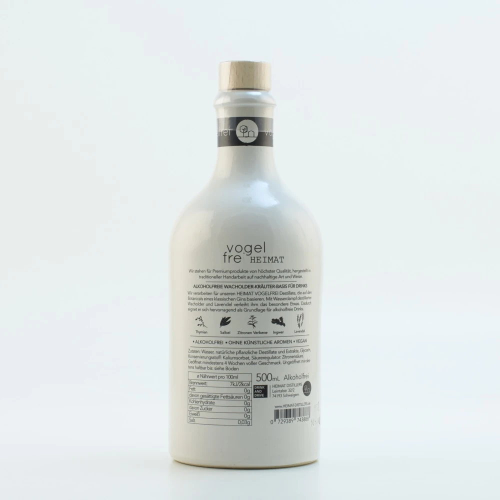Der innovative Heimat Vogelfrei alkoholfreier Gin stammt aus dem Hause der Heimat Destillerie. Diese Firma ist unter der Leitung von Tastillery für ihre Experimentierfreude bekannt und bricht gern mit der Norm. In diesem Fall ist eine wunderbare Gin-Alternative entstanden, die ohne Volumenprozent zum Kunden kommt. Der alkoholfreie Gin aus Deutschland entstand, in dem sich die Brennerei auf eine schonende Wasserdampfdestillation der Botanicals verlassen hat. Das so entstandene Produkt wird vom Hersteller außerdem als kalorienarm und als vegan beworben. Die wunderschöne Keramikflasche in Weiß mit dem Vogelmotiv betont den heimatverbundenen Charakter der trendigen alkoholfreien Spirituose.