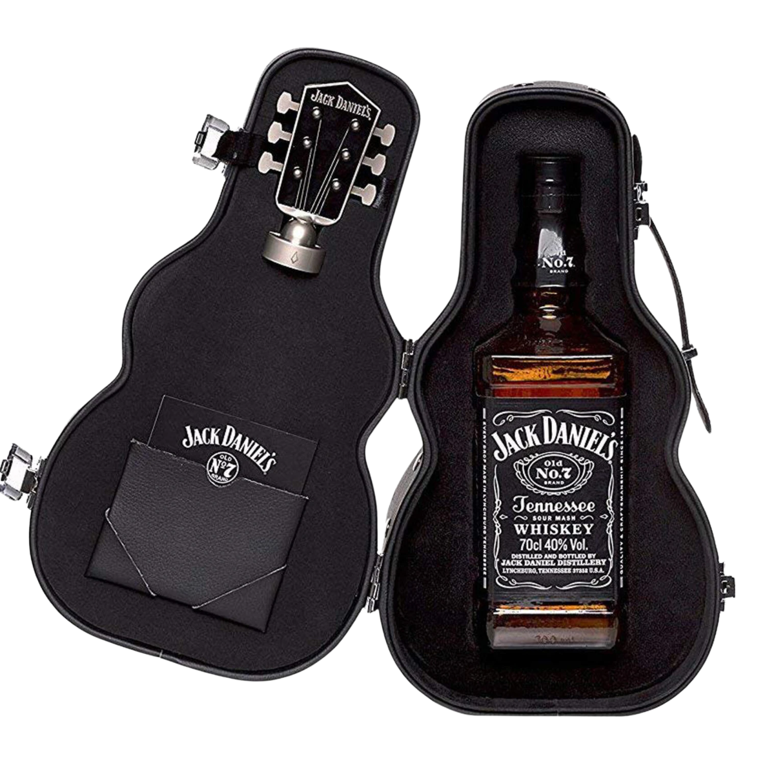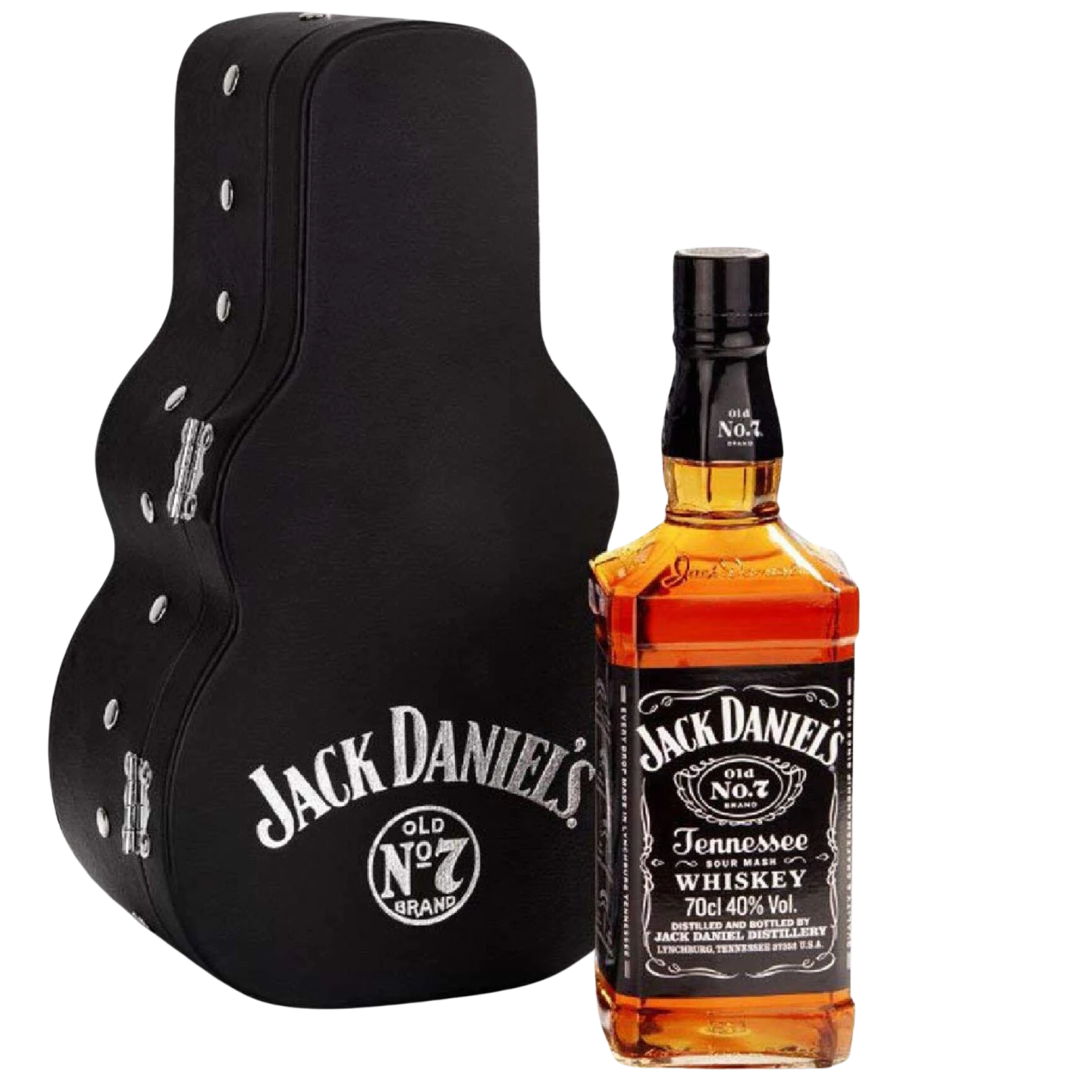 Der exklusive Jack Daniels Guitar Case wird seinen Namen gerecht. So gönnt man sich hiermit eine Limited Edition, deren Verpackung einem Gitarrenkoffer nachempfunden ist. In Schwarz gehalten und innen passend ausgelegt, umfasst diese GP nicht nur eine Flasche Jack Daniels Tennessee Whiskey aus Amerika. Darüber hinaus ist wunderschönes Zubehör enthalten, das thematisch darauf abgestimmt ist. So ist in den schwarzen Gitarrenkoffer neben dem Jack Daniels Guitar Case noch ein Stopper enthalten, mit dem man die Whiskyflasche nach dem Öffnen luftdicht wiederverschließen kann. Sein Design erinnert an das Kopfende einer Gitarre, mit dem man die Saiten stimmt. Genau aus diesem Grund handelt es sich hierbei um ein Highlight mit Seltenheitswert und um einen Blickfang. Aber auch der Whiskey aus den USA selbst, der auf dem Klassiker der Destillerie aufbaut, verdient ungeteilte Aufmerksamkeit. Im Inneren ist der No. 7 Whiskey abgefüllt, das legendäre Flaggschiff der Brennerei.