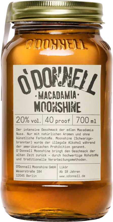 Der innovative O’Donnell Original Moonshine Macadamia stammt von einer deutschen Firma, die in Berlin ihren Sitz hat und hiermit eine alte amerikanische Tradition aufgreift. Sie gewinnt den Basisalkohol aus Getreide, was an New Make bei der Herstellung von Whisky erinnert. Anschließend geht es an das Verfeinern mit natürlichen Aromen, wobei der Hersteller auf Farbstoffe verzichtet. Die handwerklich hergestellten Spirituosen der Berliner Brennerei wandern dann nicht in reguläre Glasflaschen, sondern in die den authentischen Mason Jars nachempfundenen Einmachgläser mit Deckel. Auch der O’Donnell Original Moonshine Macadamia mit dem klassisch niedrigen Alkoholgehalt wird auf diese Weise stilecht präsentiert.