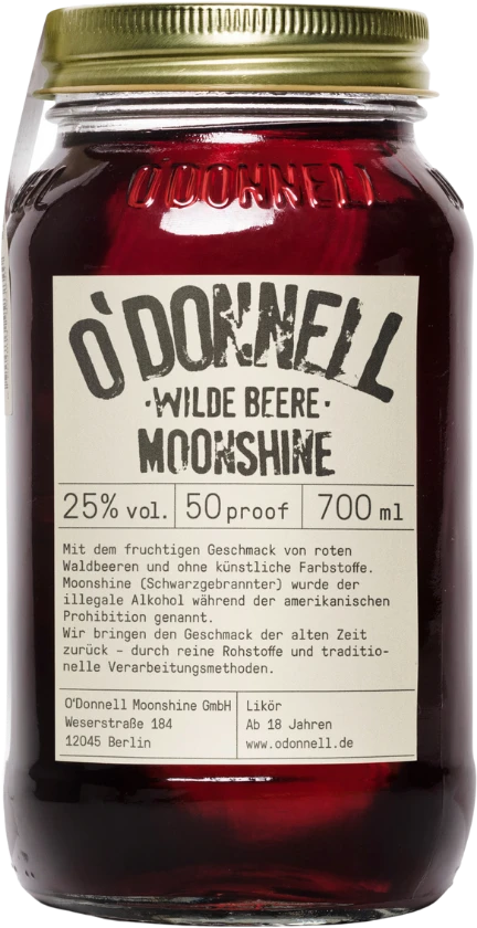 Der interessante O’Donnell Original Moonshine „Wilde Beere“ ist die bisher sechste Abfüllung der Firma, die sich der Tradition verschrieben hat und keine halben Sachen macht. Wie seine bereits beliebten Vorgänger wurde dieses Destillat in einen echten „mason jar“, also eine Art Einmachglas, abgefüllt. So wollte man damals die schwarzgebrannten Spirituosen verstecken. Heute entsteht der Moonshine natürlich ganz legal, und er steckt voller nostalgischem Wiedererkennungswert. Der leuchtend rote O’Donnell Original Moonshine „Wilde Beere“ macht aus seiner Persönlichkeit keinen Hehl: Er setzt auf die Kraft der wildwachsenden Beeren und erinnert damit noch mehr an Marmelade im Glas.