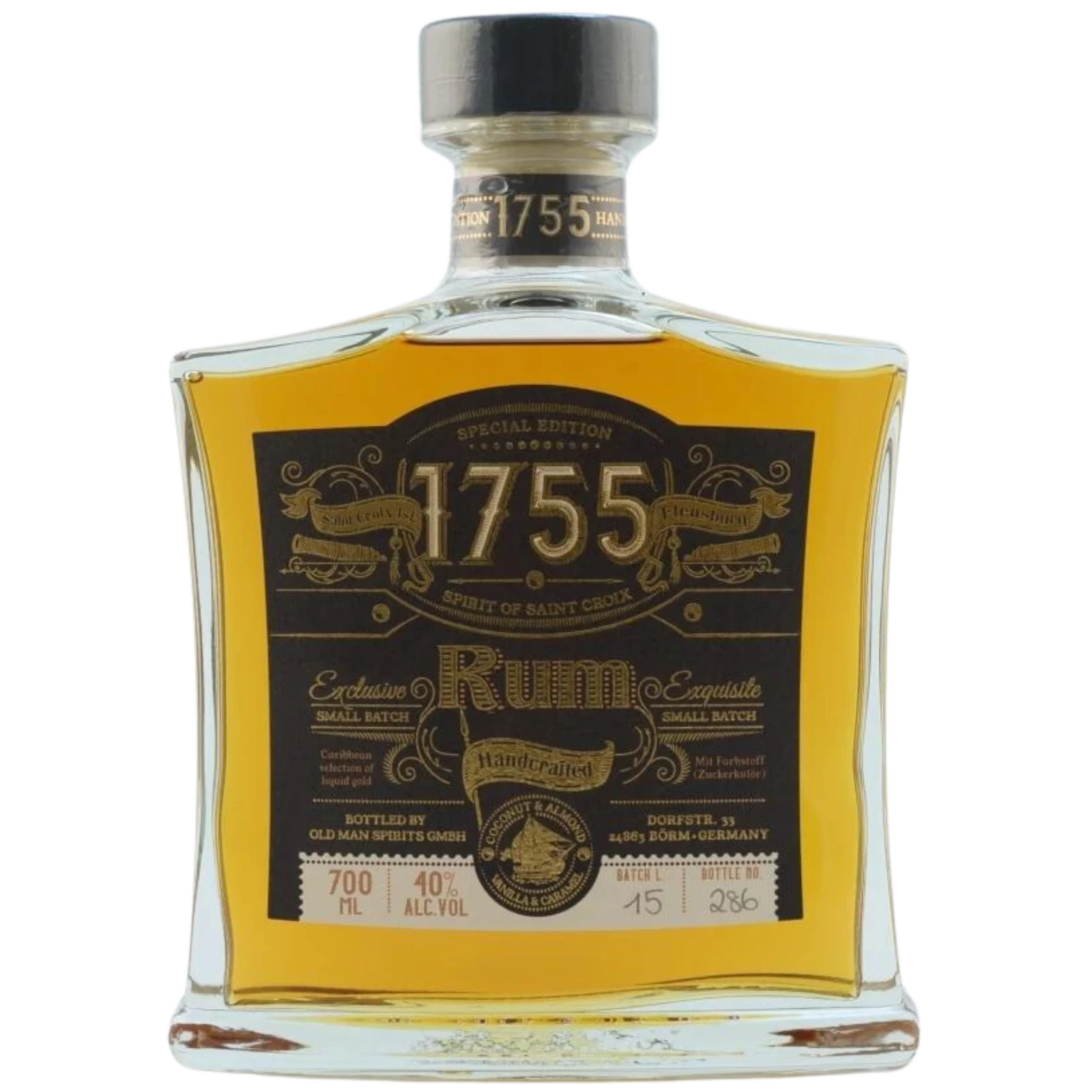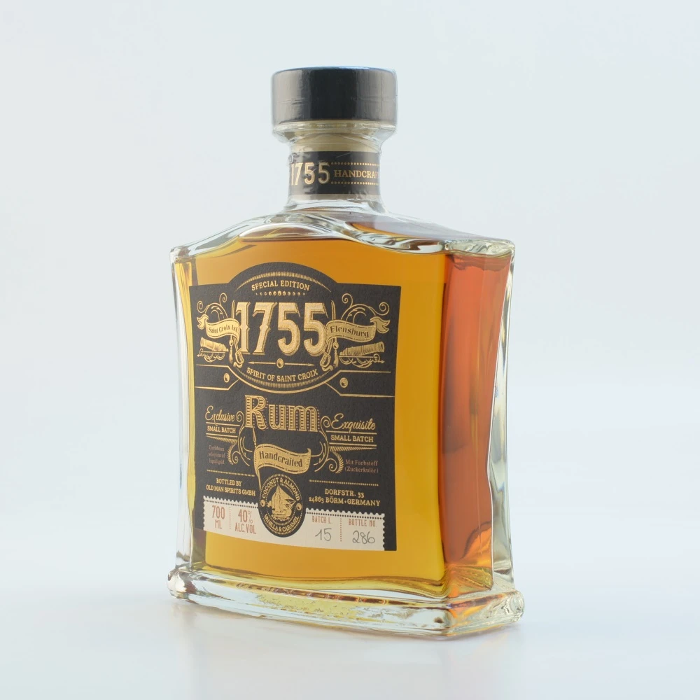 Der Rum 1755 trägt den Geist der Insel St Croix i n sich. Handgemacht in einer Manufaktur im Norden Schleswig-Holsteins, eine halbe Stunde entfernt von der dänischen Grenze. Dort wird die Rezeptur akribisch eingehalten und in sorgfältiger Handarbeit der unwiderstehliche Rum 1755 abgestimmt. Das Cuvee besteht aus mehreren verschiedenen, karibischen Sorten Rum. Die dafür nötigen und hochwertigen Premium Rums werden dazu sehr sorgfältig und in einem langen Prozess aus hunderten dafür ausgewählt. Der Master Blender entscheidet dann, welche Rum-Sorten für diesen exquisiten Rum 1755 in Frage kommen.