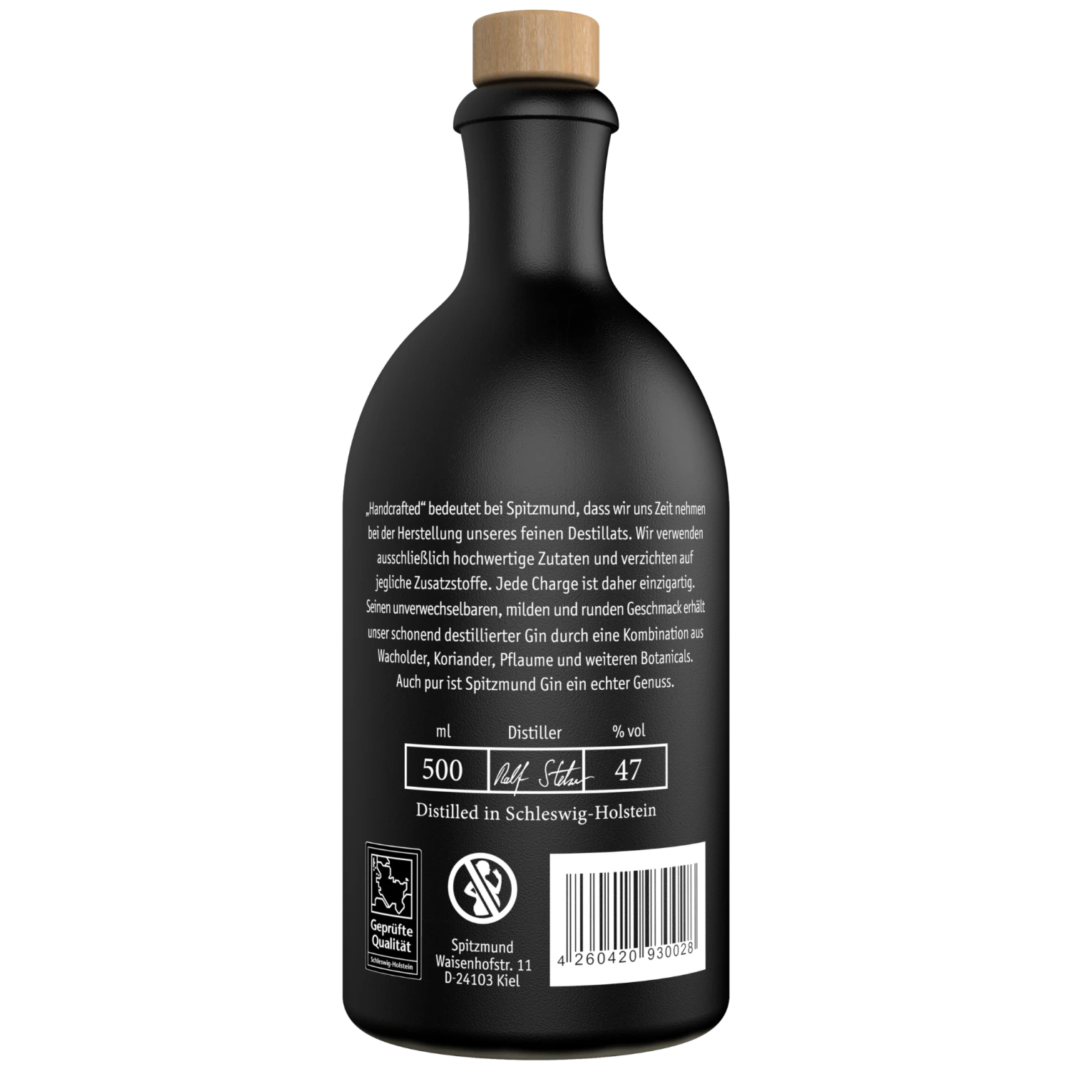 Der exquisite Spitzmund Gin New Western Dry entsteht in einer kleinen Brennerei im Hohen Norden des Landes. Verantwortlich für die Produktion in geringen Mengen ist Andreas Werner, der die Marke unlängst ins Leben rief. Er hat sich dafür entschieden, mit seinem Wacholderschnaps ein Ausnahmeprodukt auf den Markt zu bringen, um gegen all die Konkurrenz aus dem Inland und Ausland anzukommen. Der Spitzmund Gin New Western Dry aus der markanten schwarzen Flasche wurde deshalb mit einem erhöhten Alkoholgehalt abgefüllt, was ein wenig an Navy Strength Gin aus England denken lässt. Pro Abfüllungscharge konzentriert sich der Brennmeister auf nur 700 Flaschen. Sein small batch Gin ist damit eigentlich eine limitierte Sonderedition und besitzt Sammelwert.