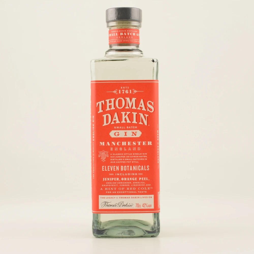 Der hochwertige Thomas Dakin Small Batch Gin wird in geringen Chargen hergestellt, was die Produktion mit Liebe zum Detail ermöglicht. Der small batch Gin aus Manchester gehört in das Sortiment der angesehenen Firma G&J Greenall. Thomas Dakin, der Namensvetter, gründete in der zweiten Hälfte des 19. Jahrhunderts in Warrington den Betrieb, der später zu Greenall’s wurde. Der feine Thomas Dakin Small Batch Gin ist von klarer Farbe und macht mit seinem großen, roten Etikett auf sich aufmerksam. Er ist eine Hommage an seinen Namensgeber, der als Pionier der Gin-Welt gilt. Nur speziell ausgesuchte Botanicals kommen zur Aromatisierung zum Einsatz, sodass der Wacholderschnaps mit Premium-Qualität sich von seiner besten Seite zeigt.