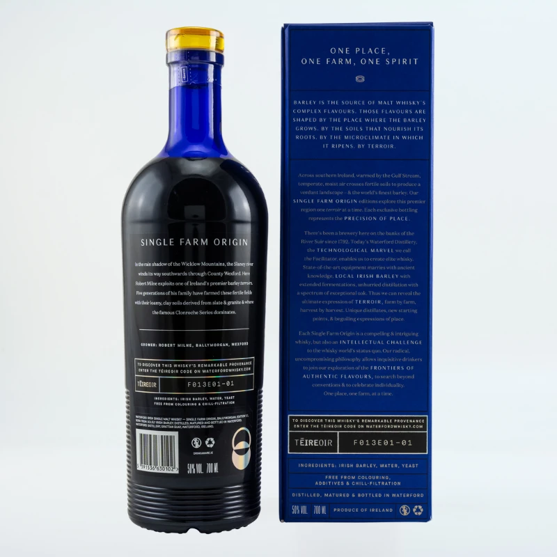 Dem Terroir-Gedanken begegnen wir eigentlich nur beim Wein. Er trägt der Annahme Rechnung, dass der Standort (für den Anbau des Rohstoffes verwendet) sich mit seiner Bodenbeschaffenheit und seinem Mikroklima auf das Produkt auswirkt. Diesen Gedanken haben in letzter Zeit auch einige Hersteller von Rum und Whisky aufgegriffen. In ihrem Fall kommt z. B. nur Zuckerrohr einer Plantage/Parzelle oder Gerste einer Region zum Einsatz. Einen Schritt weiter geht der Waterford Single Farm Origin Ballymorgan 1.1 Whisky 2016/2020 gemeinsam mit seinen Brüdern. Jeder Irish Whiskey dieser Sonderserie basiert auf Getreide von nur einem landwirtschaftlichen Betrieb aus dem im Titel angegebenen Gebiet.